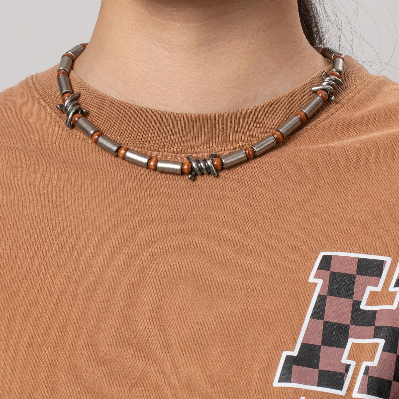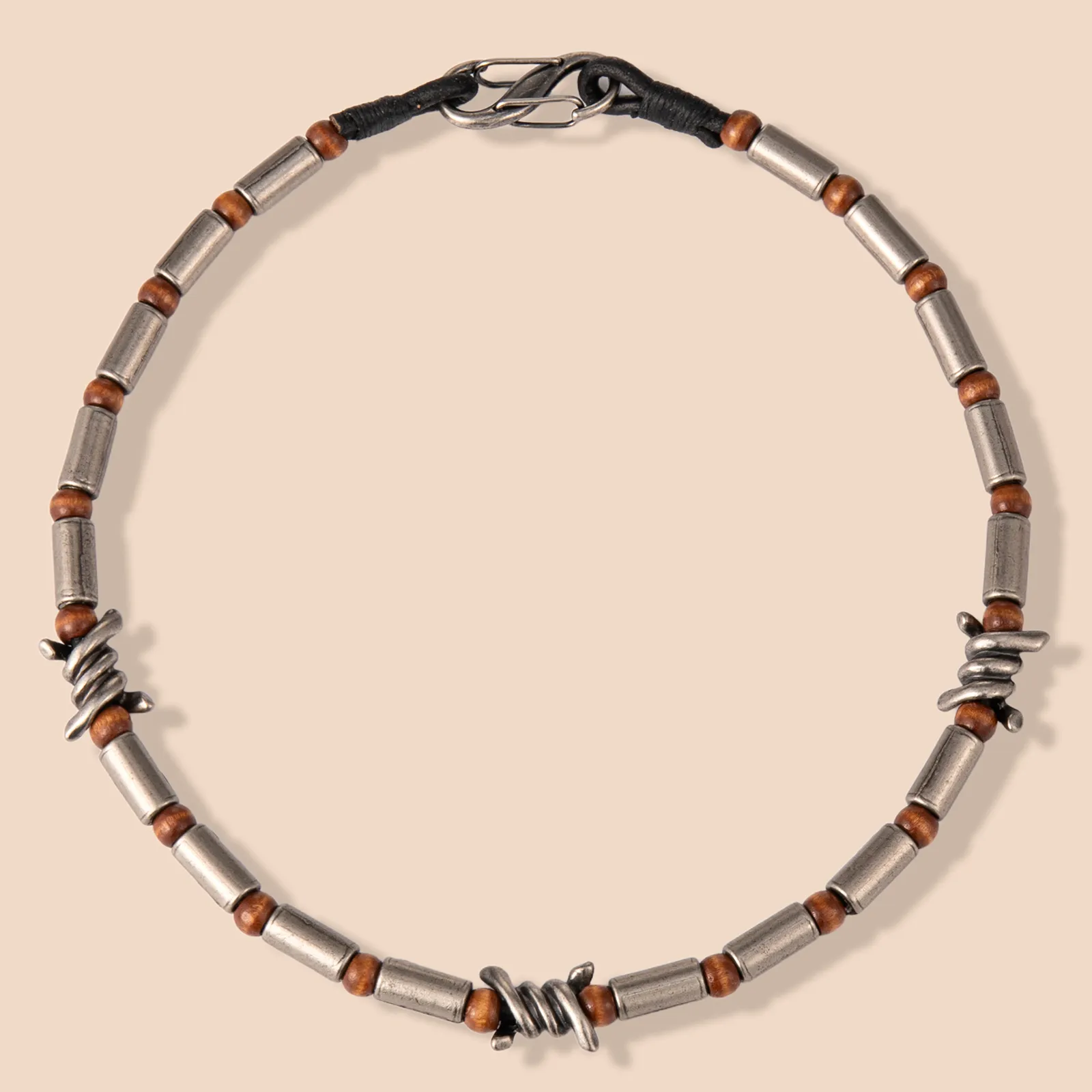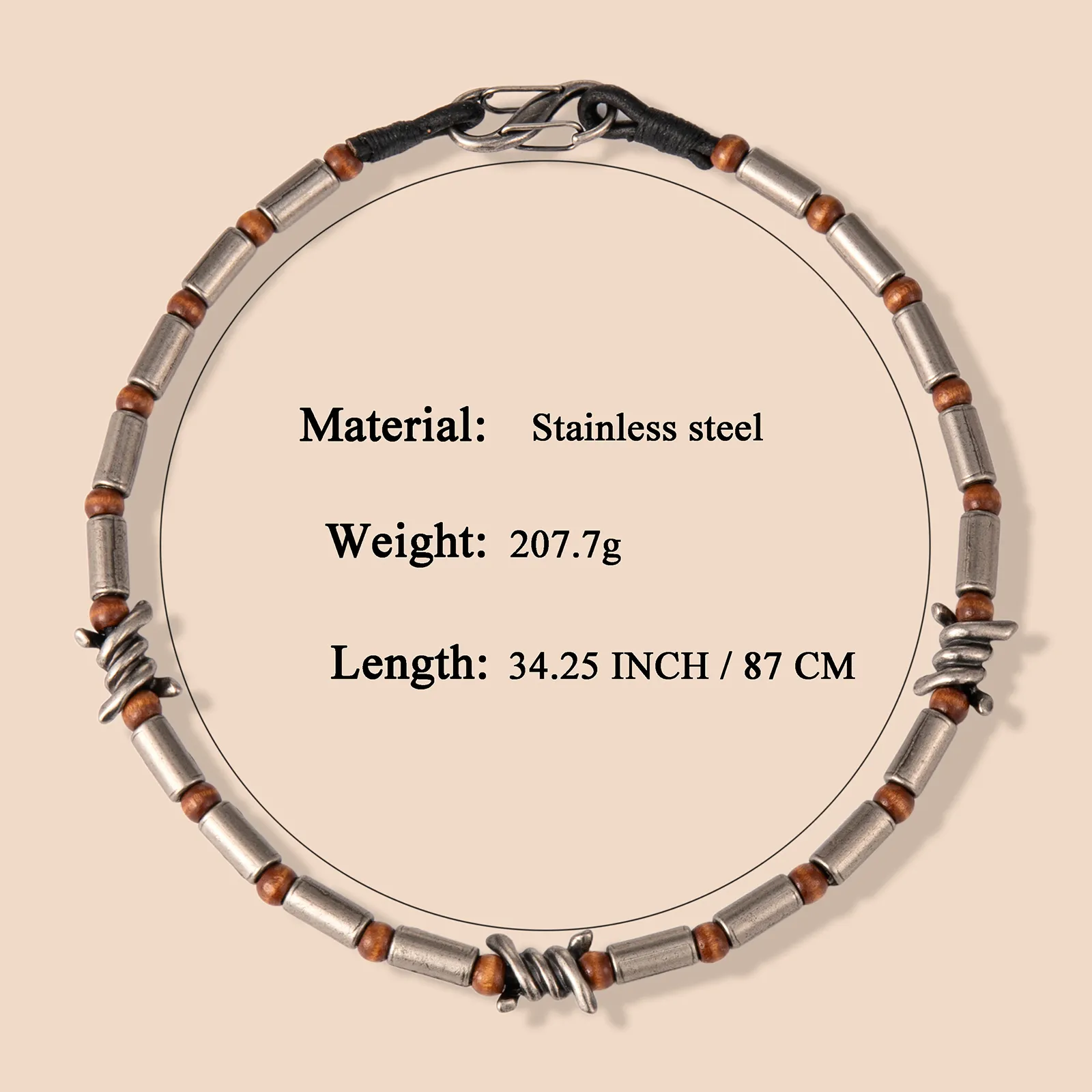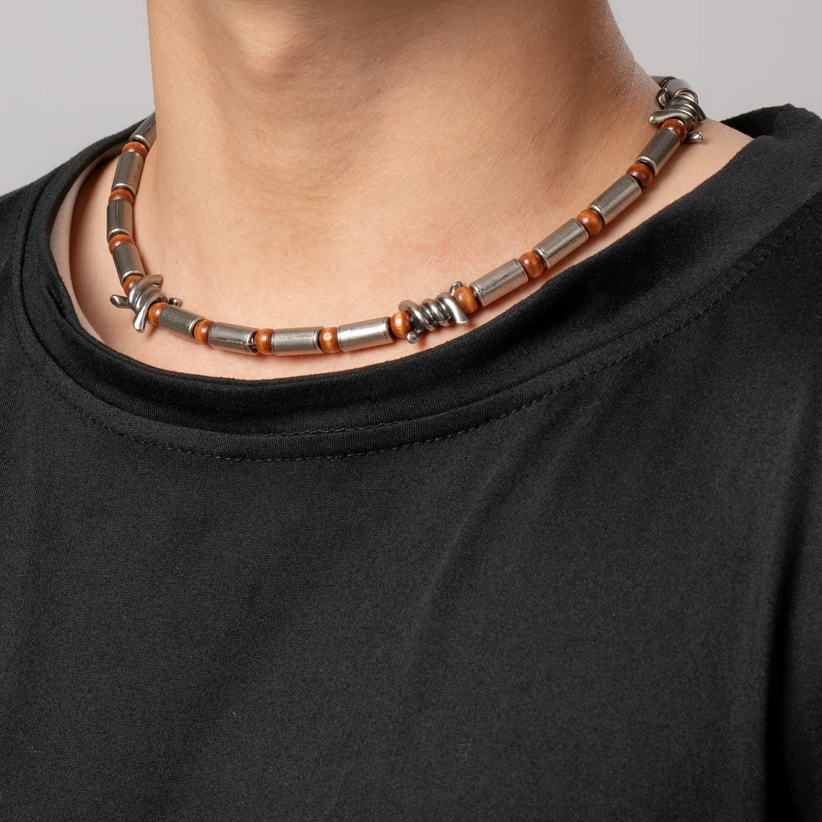 Custom Stainless Steel Cylindrical Barrel and Wood Bead Necklace with Barbed Wire for E-commerce Stores