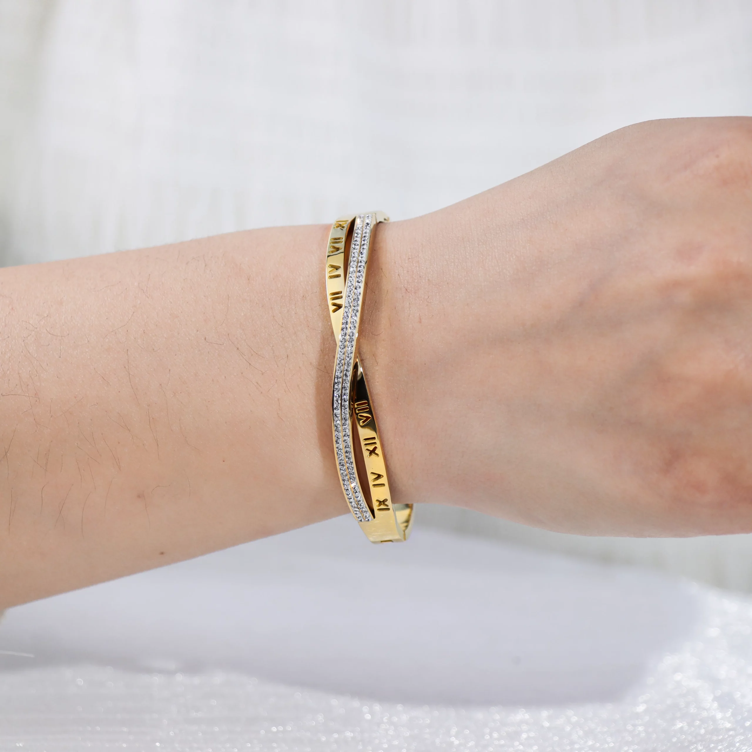 Roman Numeral Cross Over Stainless Steel Bangle Bracelet | Customizable Size